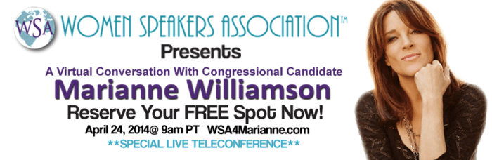 On April 24th at 9 AM PT…Women Speakers Association (WSA) will host an unprecedented special event. For the first time in history, WSA will open up their lines to the general public for a FREE TELECONFERENCE with a political candidate whose platform reflects the vision of WSA…a world in which women take ownership of and step into being the leaders that they are; using their voice to powerfully inspire others, thus causing transformation in the lives of their clients, their companies, communities and the world.